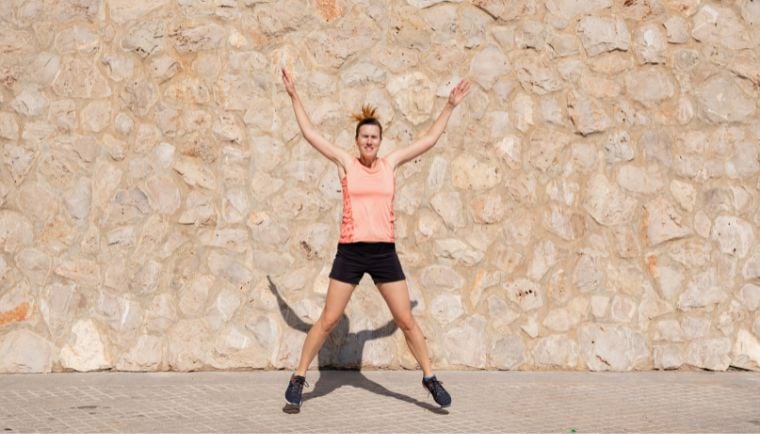 Denne øvelsen får pulsen til å øke litt og er en god øvelse hvor du bruker hele kroppen! Hvis det blir for tungt å hoppe kan du også velge å gå ut til siden, dette gjelder også hvis du f.eks. sliter med kneskade og bør unngå hopping.